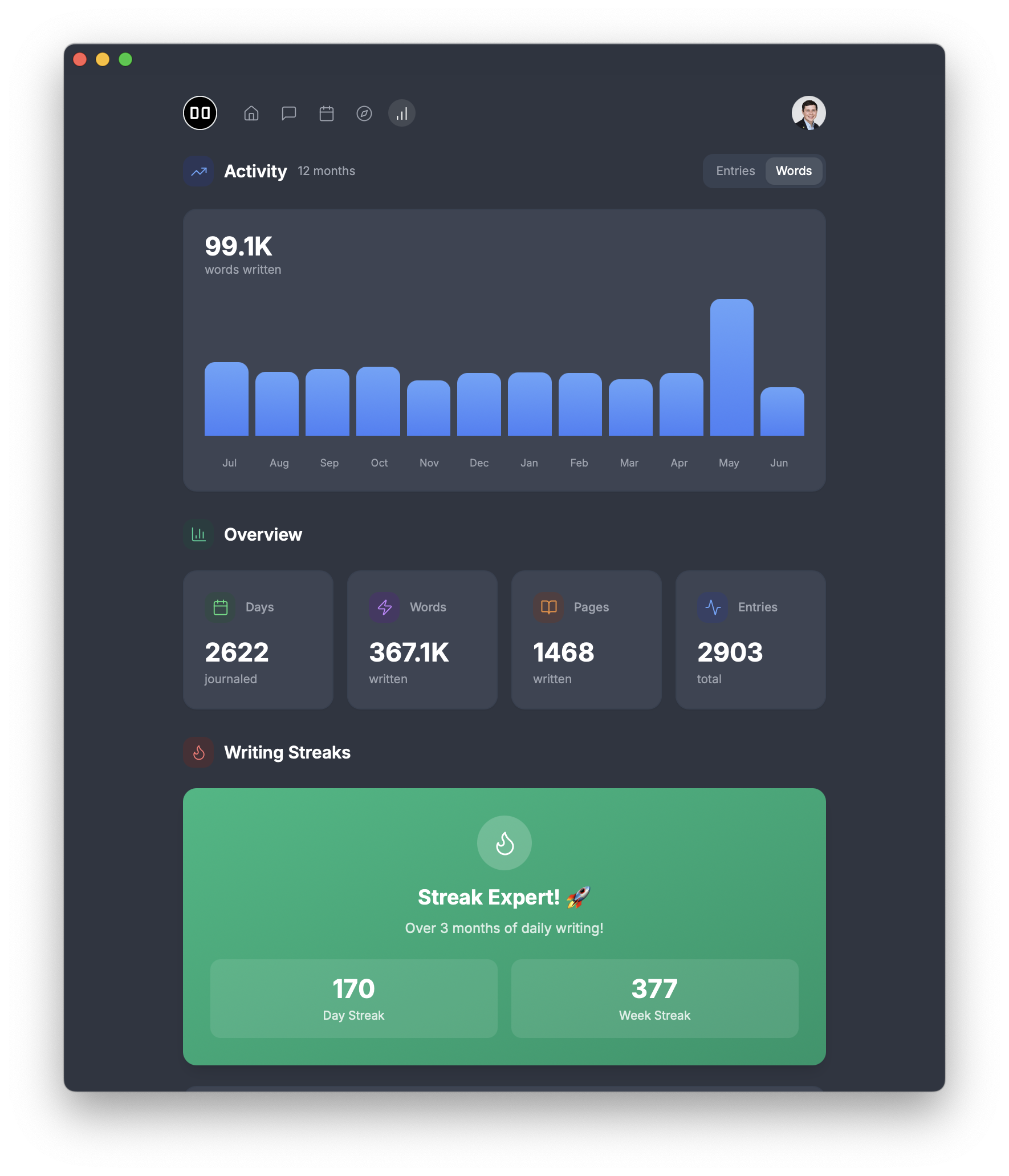 Visualize your journaling patterns and reflect on your writing consistency with beautiful charts.